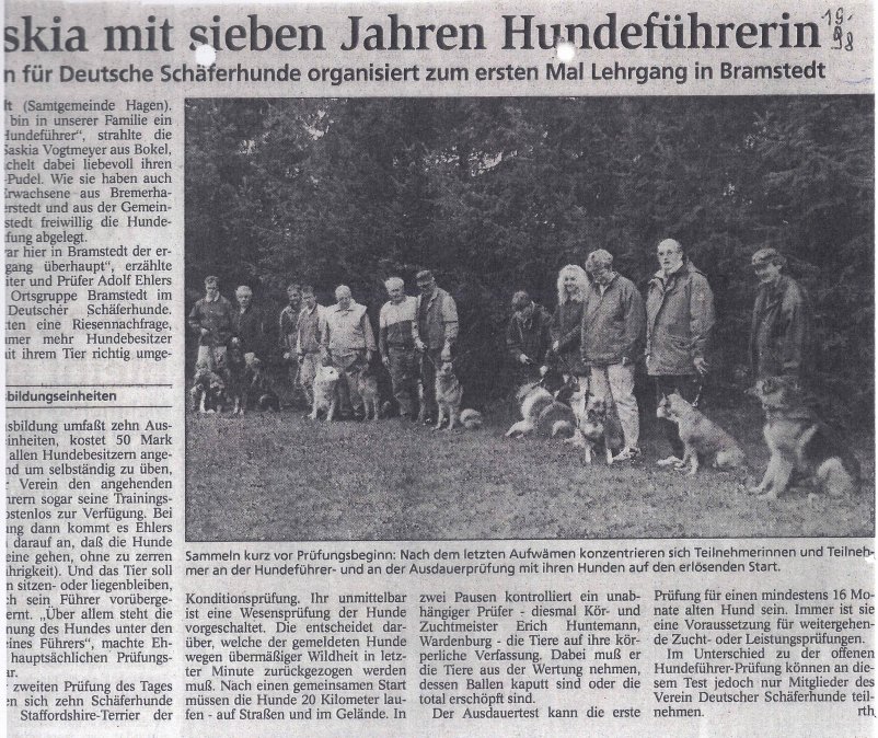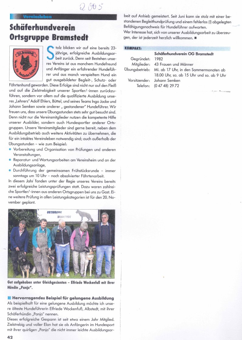 Am 19. Februar 1982 wurde die Ortsgruppe Bramstedt im Schäferhundverein (SV) gegründet. 16 Gründungsmitglieder folgten dem Aufruf zur Gründungsversammlung, die im Hotel Janßen in Bramstedt stattfand. Lothar Kuhlenkamp wurde einstimmmig zum 1. Vorsitzenden gewählt.